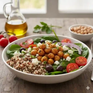- Lunch: A Mediterranean salad with cucumbers, tomatoes, chickpeas, feta cheese, and a drizzle of olive oil.