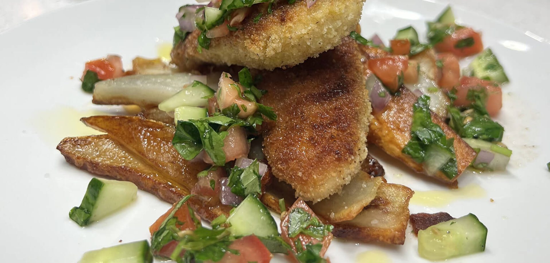 Enjoy juicy and flavorful chicken schnitzel served with crispy olive oil pan fried potatoes, plus the perfect accompaniment - Persian Shirazi salad.