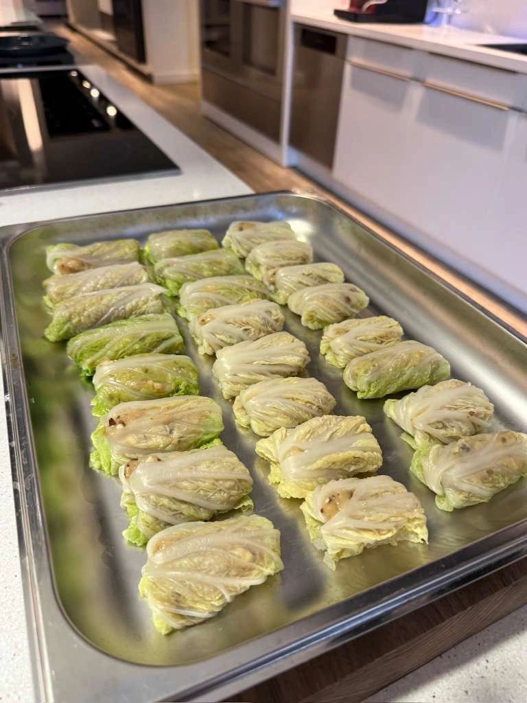 Prep time: ~35 minutes (blanch and prep cabbage leaves, cool and dry them, chop fillings, mix filling, wrap ~20 dumplings)